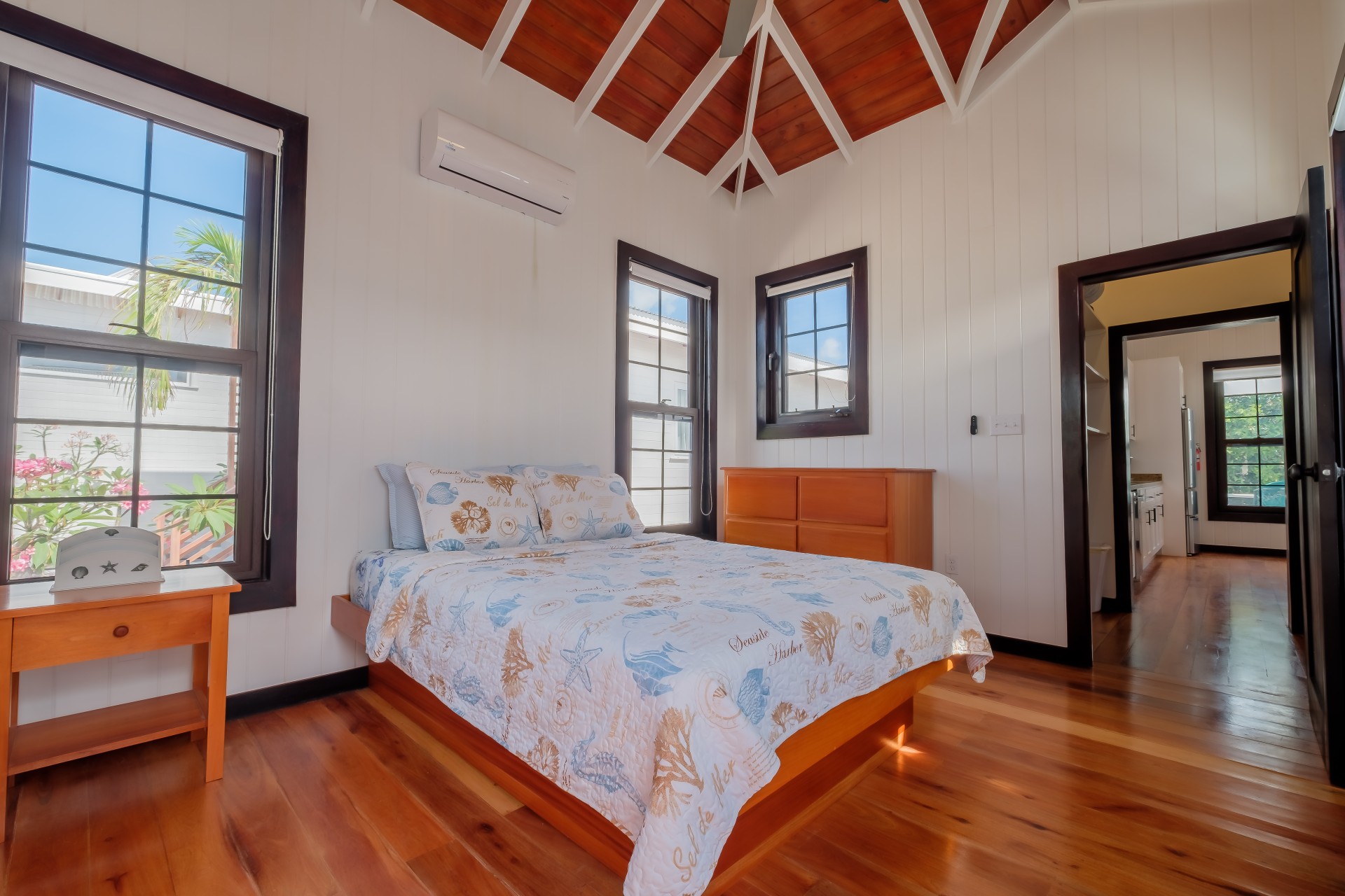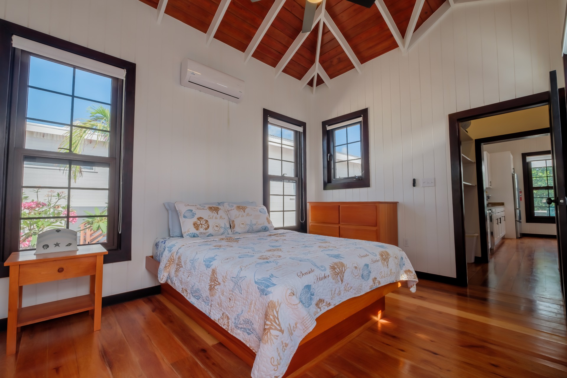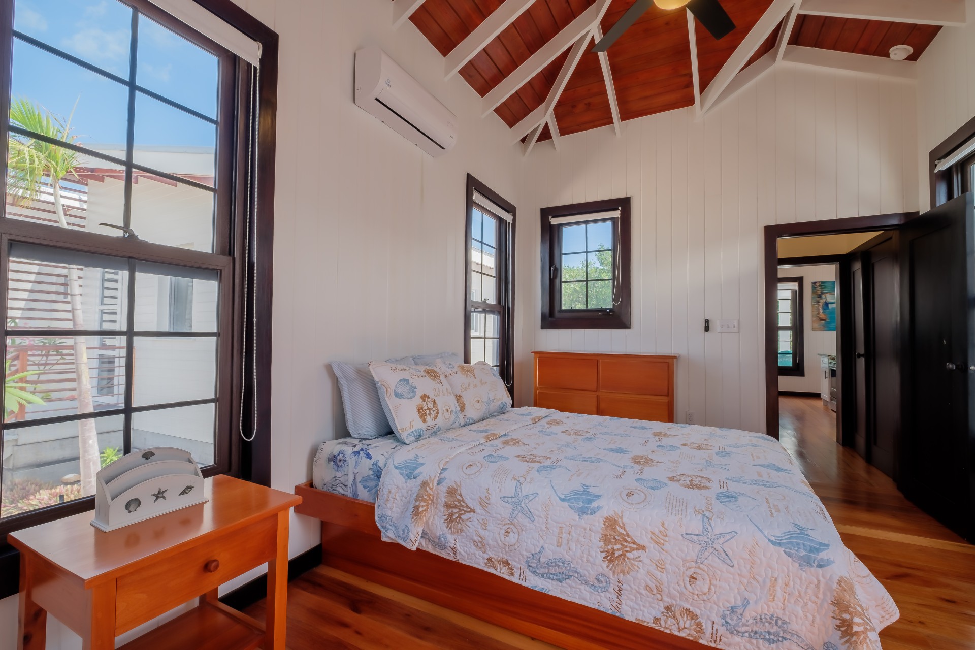 Inside, you’ll find rich local hardwood finishes, soaring vaulted ceilings, mahogany cabinetry, and high-end granite countertops. Each bedroom features an en-suite bathroom for privacy and comfort. The open floor plan includes a half bath, split A/C units, ceiling fans, stainless steel appliances, and a spacious laundry pantry with a stackable washer and dryer.
