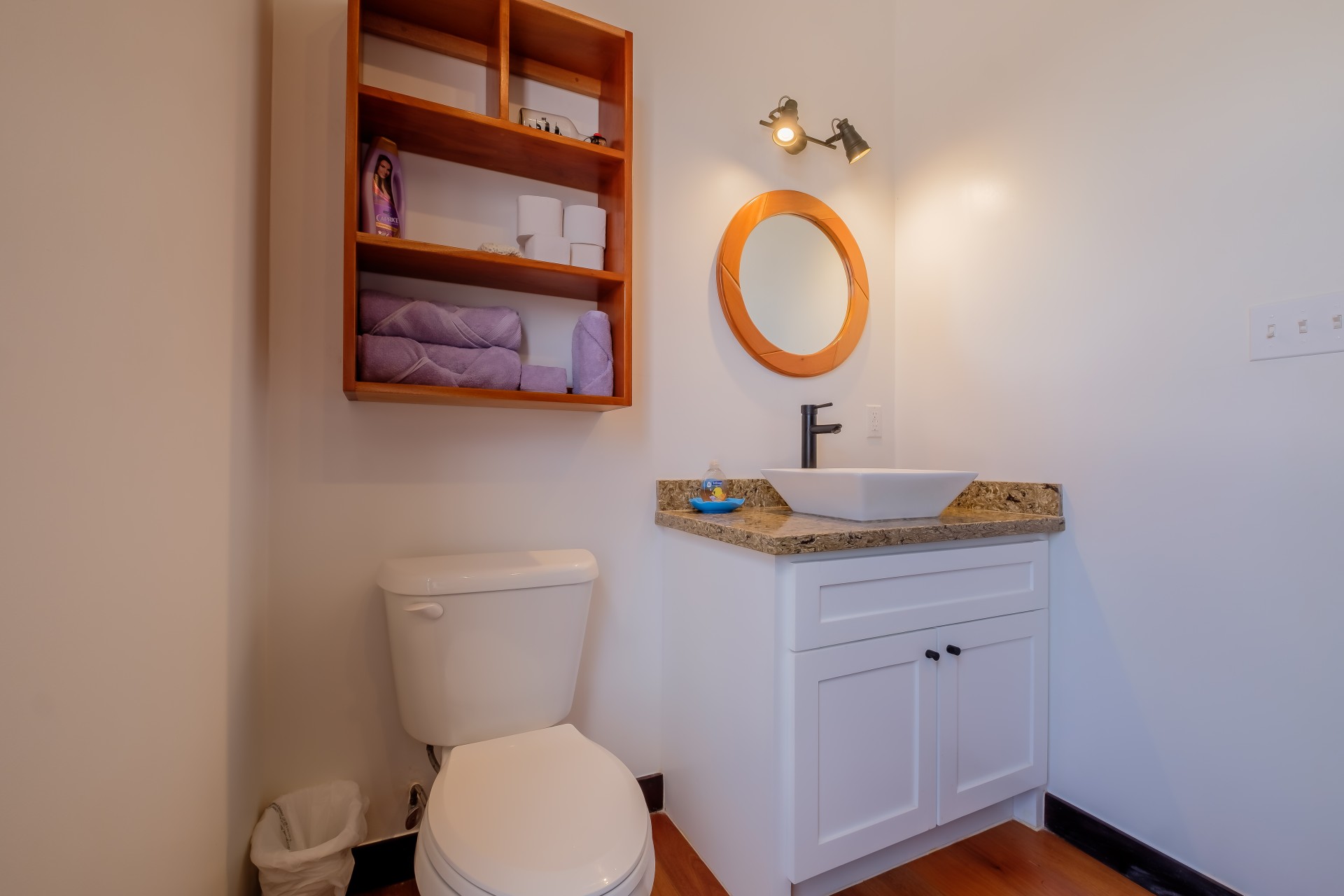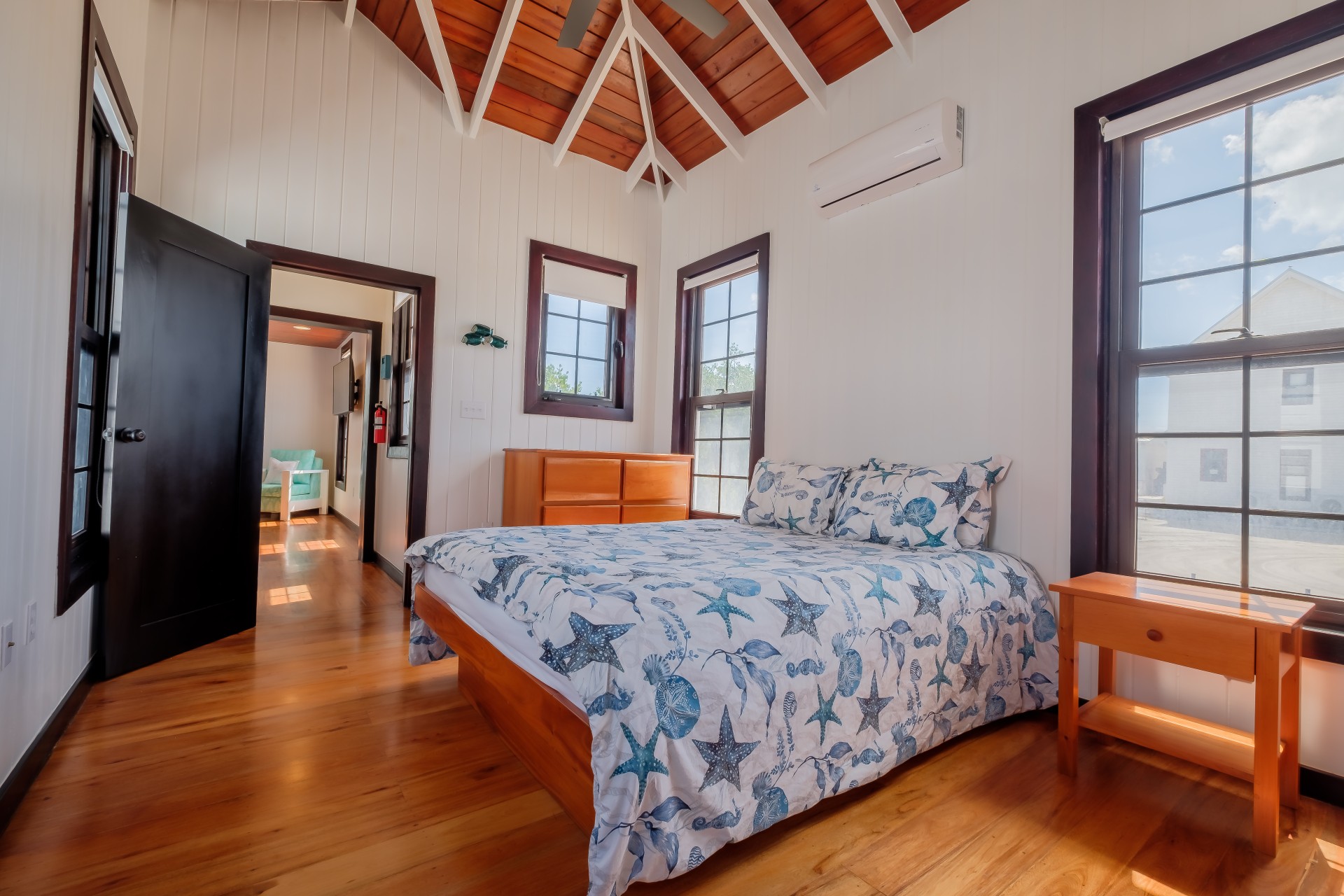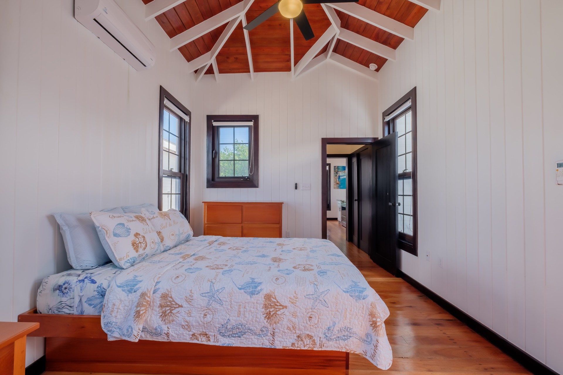 Inside, you’ll find rich local hardwood finishes, soaring vaulted ceilings, mahogany cabinetry, and high-end granite countertops. Each bedroom features an en-suite bathroom for privacy and comfort. The open floor plan includes a half bath, split A/C units, ceiling fans, stainless steel appliances, and a spacious laundry pantry with a stackable washer and dryer.