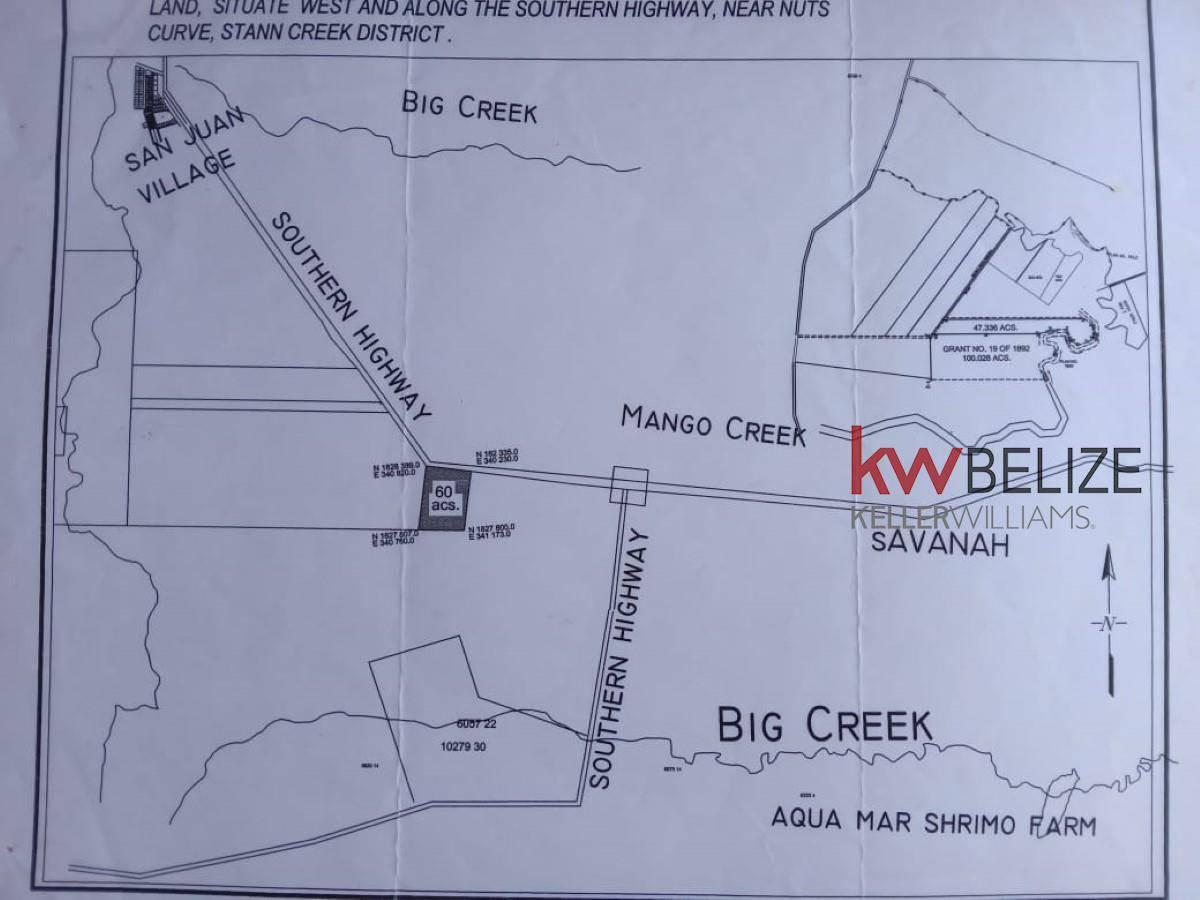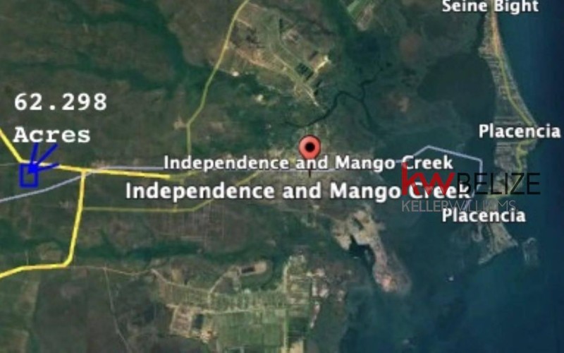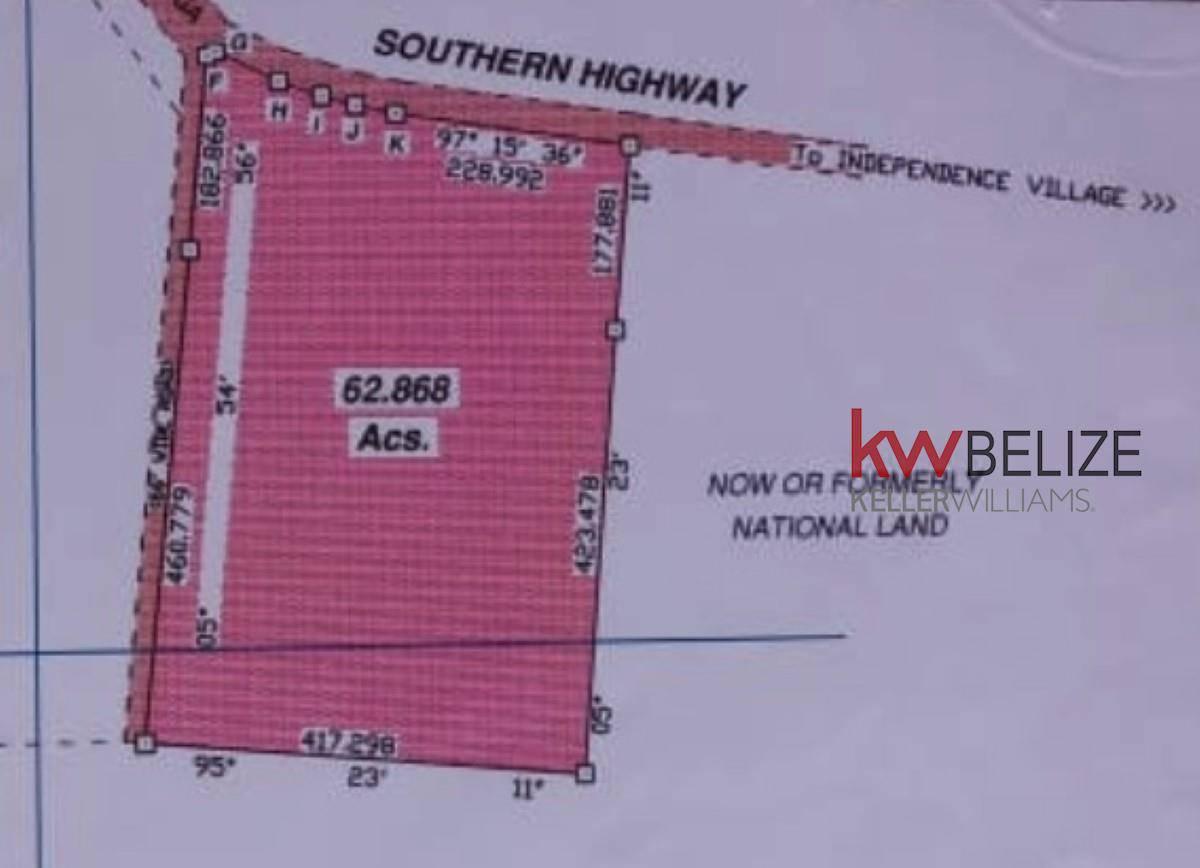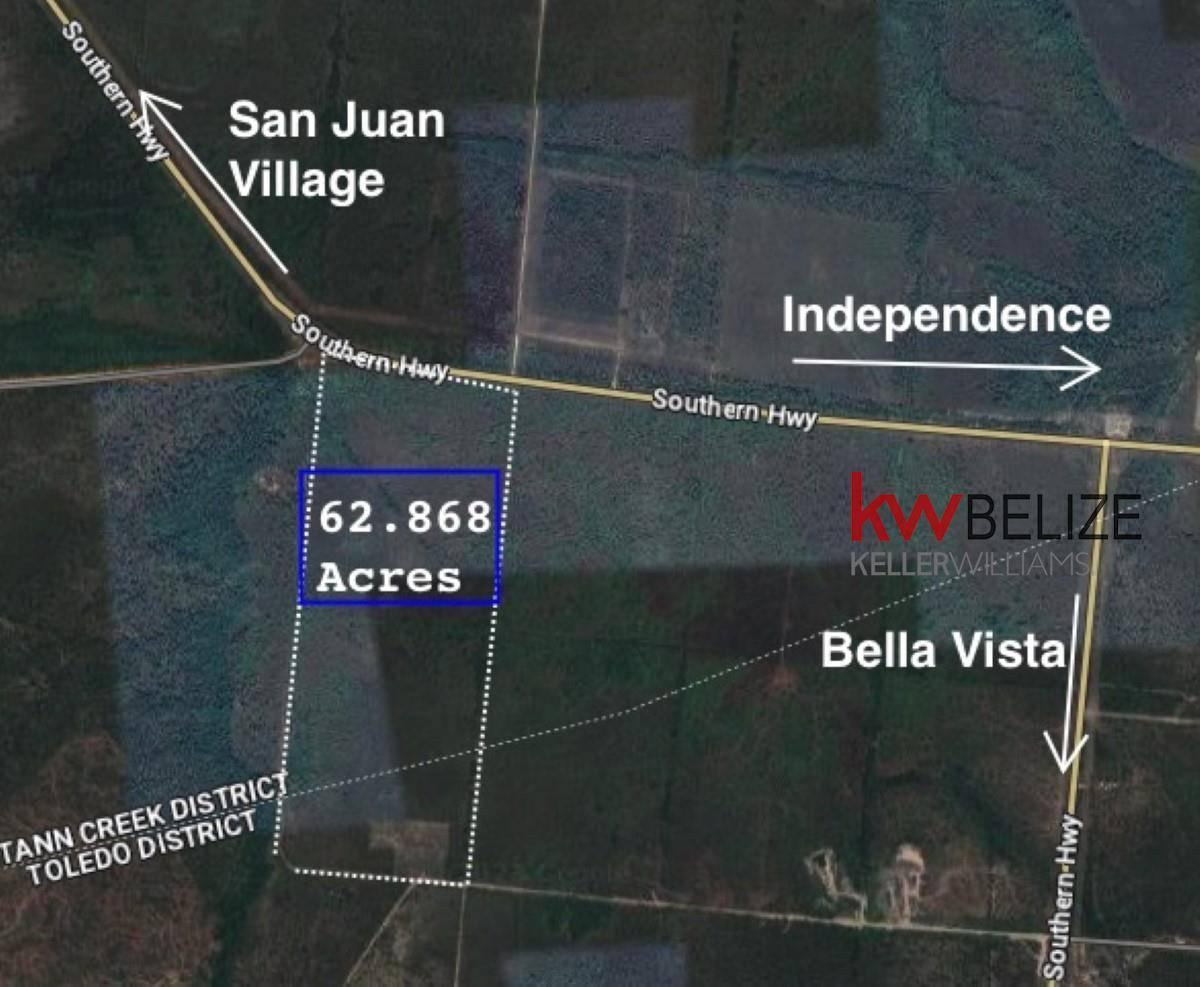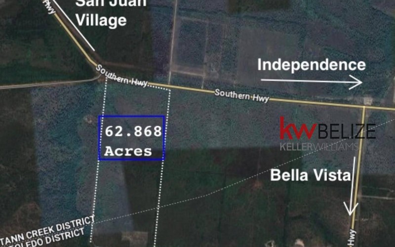Keller Williams Belize is pleased to announce the Exclusive listing of this 62.9 Acre raw land parcel on the Southern Highway. This parcel is located less than a mile West from the Bella Vista Junction, 3 miles West of the Savannah Airport, 4 miles West of Independence and only 6 miles from the Caribbean Sea. The acreage sits directly on the Southern Highway which allows for owner to easily hook up to electricity. There are dirt roads on both the East and West of the property that provide easy access. The Southside of the property measures 1,369 Ft wide and the Westside of the property measures 2,111 ft long. The ground is in it's natural state and is high and dry and ready to build. This area is good for Coconut Farms or Hobby Farm. This is a great opportunity to own a rural piece of land that is still close to shopping and amenities.